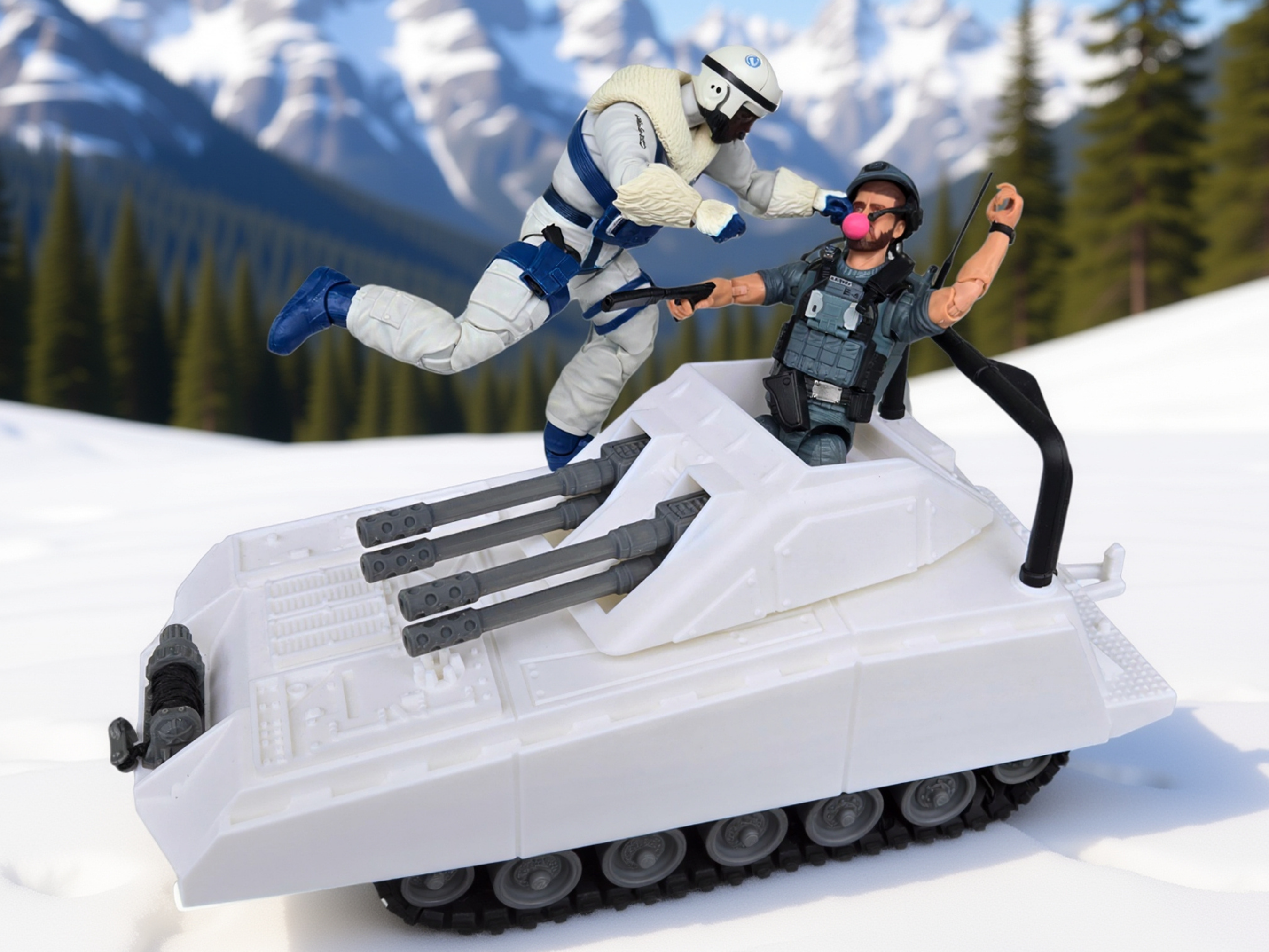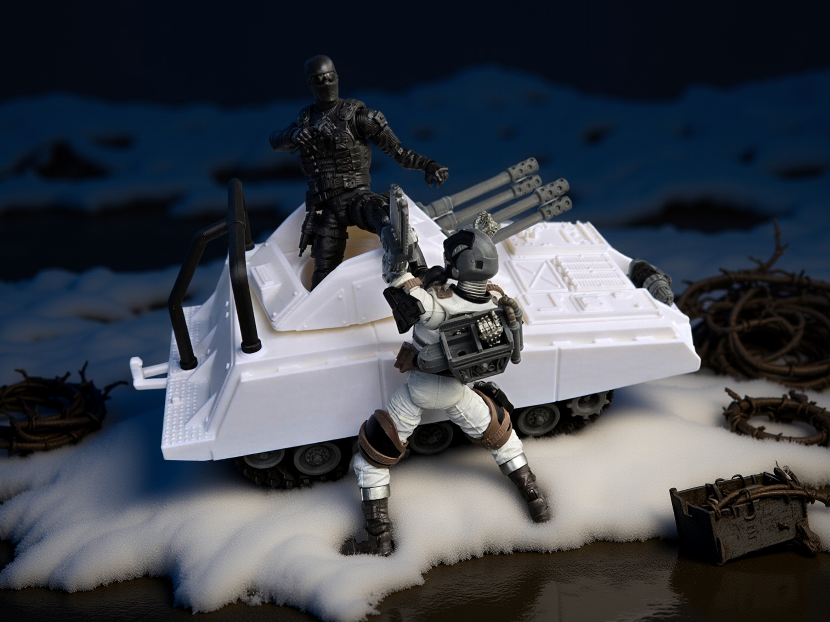 Premium quality, highly detailed 3D print of the Armadillo in Artic colors! Choose whether GI Joe or Cobra gets the artic version of the Armadillo! Top turret that rotates and now more detailed twin double barrel guns that elevate. Comes equipped with a new working winch to tow vehicles back to safety or get them unstuck. New trailer hitch for towing our Road Toad or an MMS. Yet another new feature is working linked tank treads that make it sound like a tank when rolled on your carpet! Made to fit GI Joe Classified scale, Valaverse, or other 1:12 scale figures. No action figures or other props are included, for illustration only.