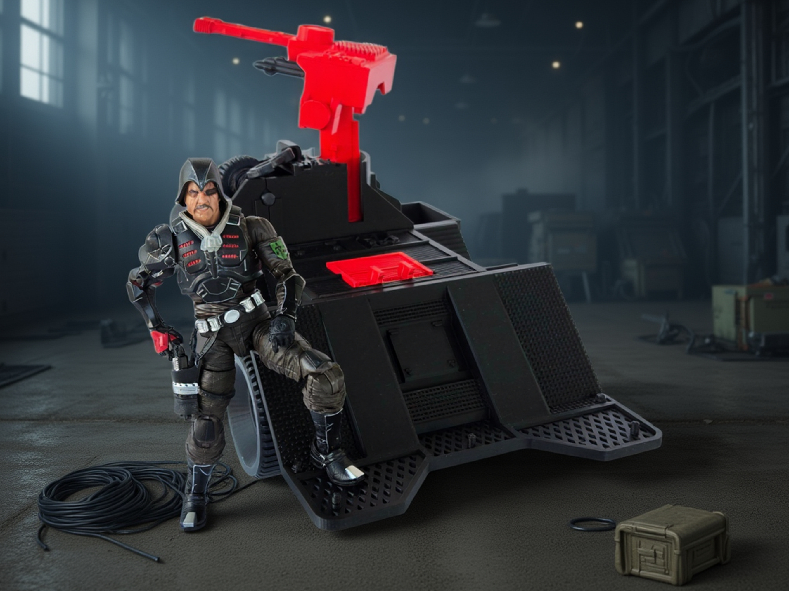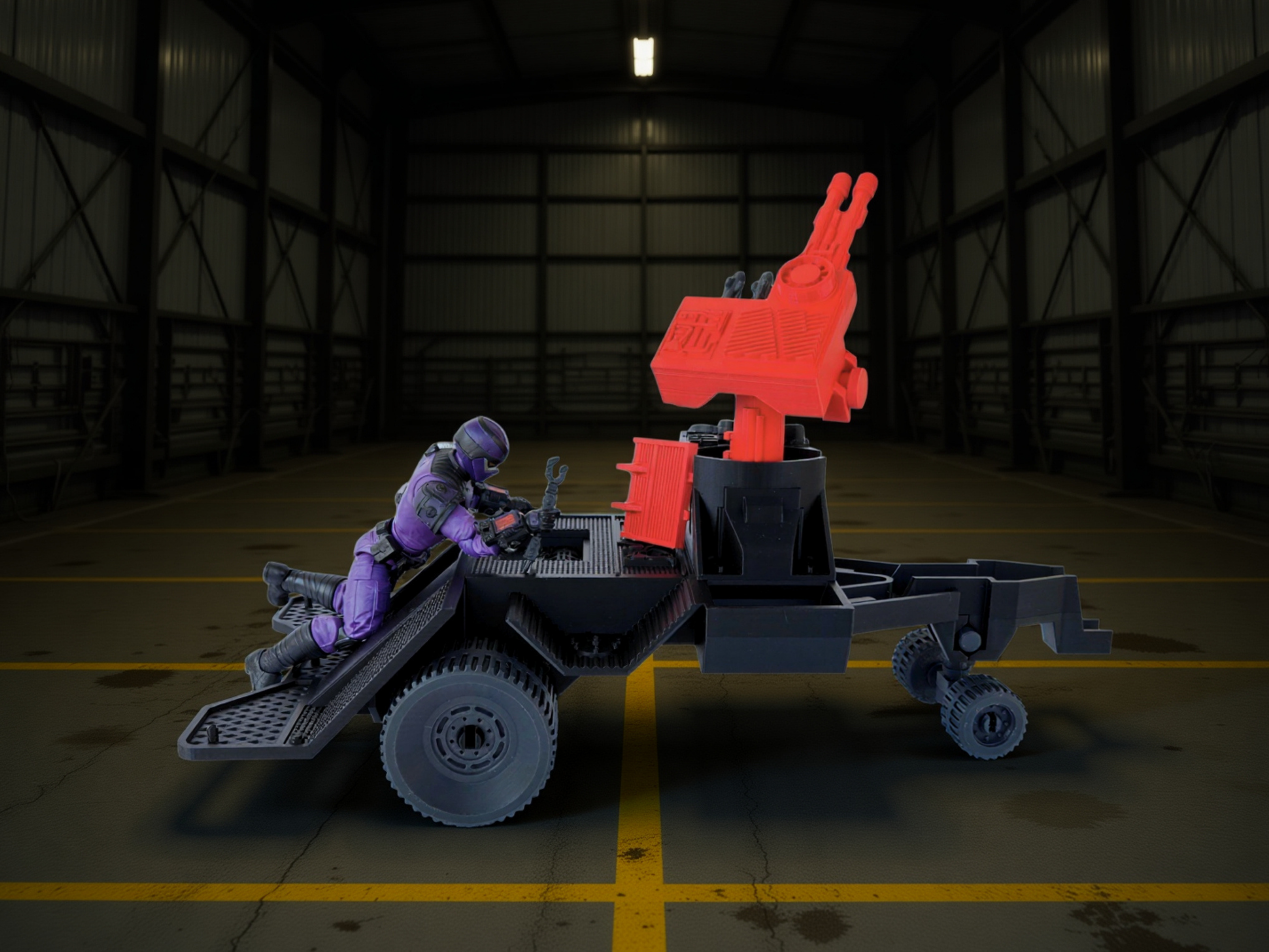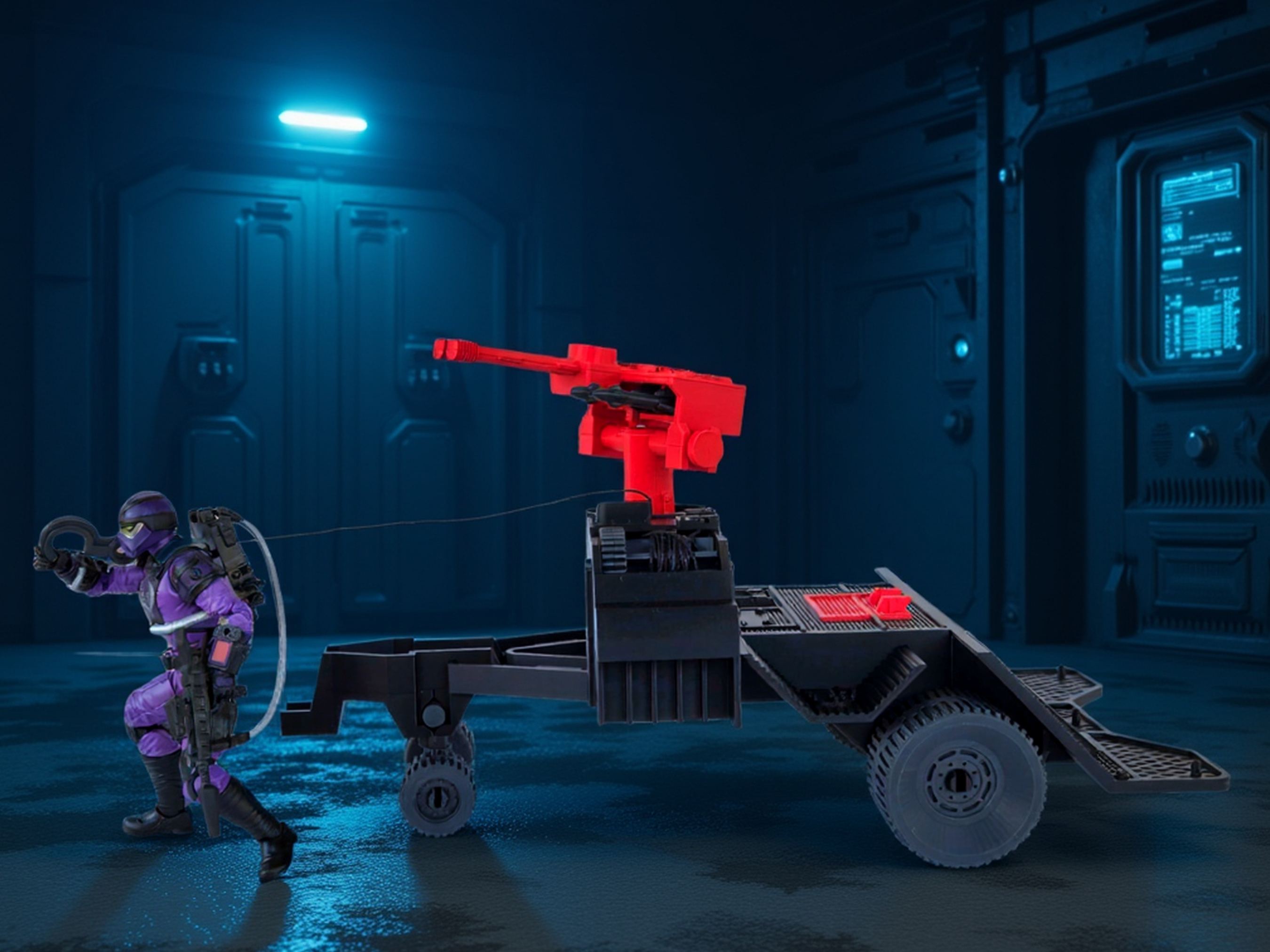 Recover your damaged vehicle before GI Joe recovers them and repairs them for GI Joe! The Road Snake battlefield recovery vehicle is used as a tow dolly to get your vehicle back to headquarters for repairs. Equipped with a swiveling turret multi position machine gun and two removeable guided missiles for defense in any direction! Features a removeable engine cover to to allow any necessary maintenance and repairs. Working winch to help pull damaged vehicles up on the tow dolly. Front wheels pivot upwards to aid in hitching it up to vehicles and get them to towing! Does not fit the Thunder Machine due to the jet engine nozzle. Made to fit GI Joe Classified scale, Valaverse, or other 1:12 scale figures. No action figures, other vehicles, or props are included, for illustration only.