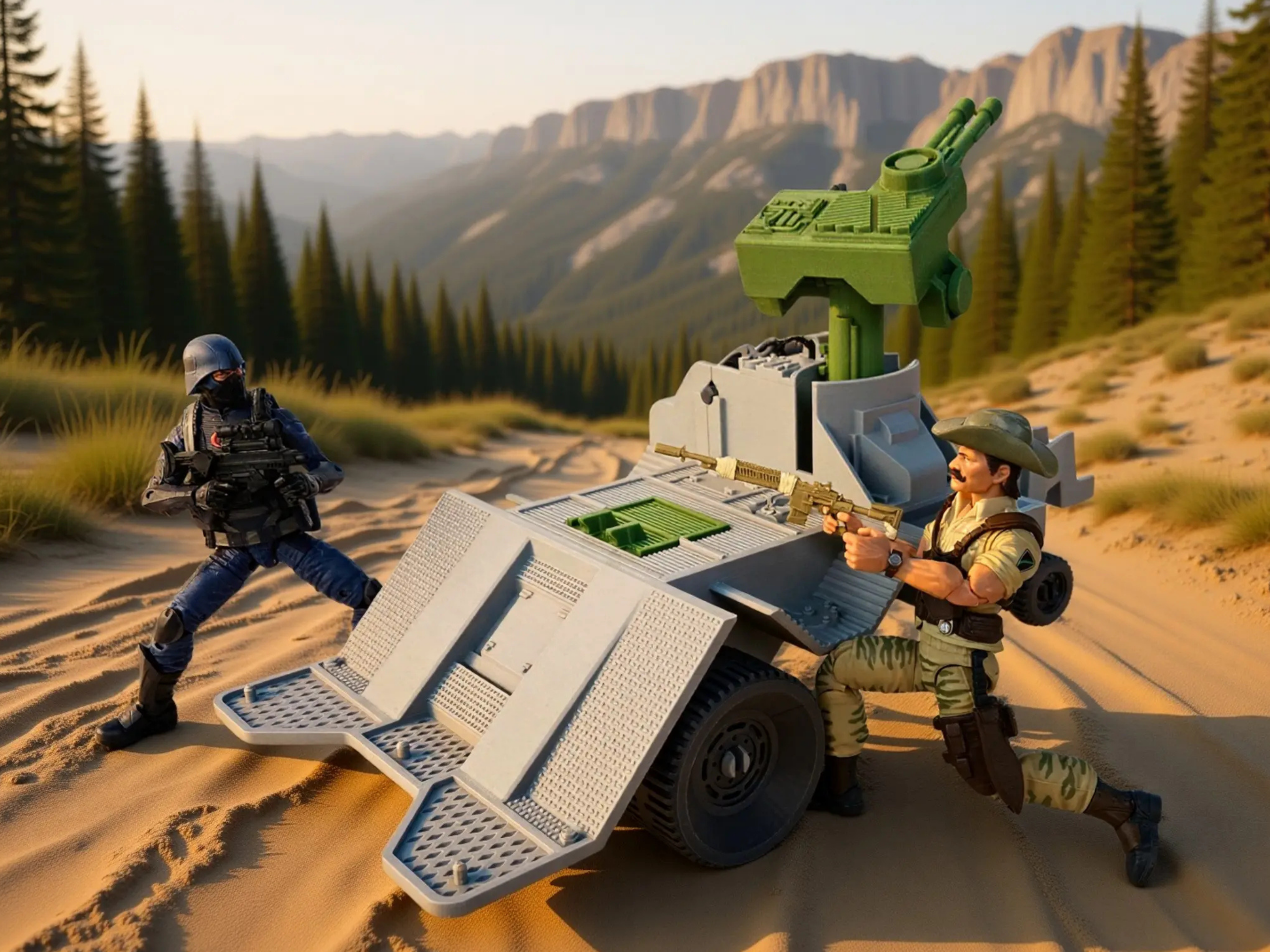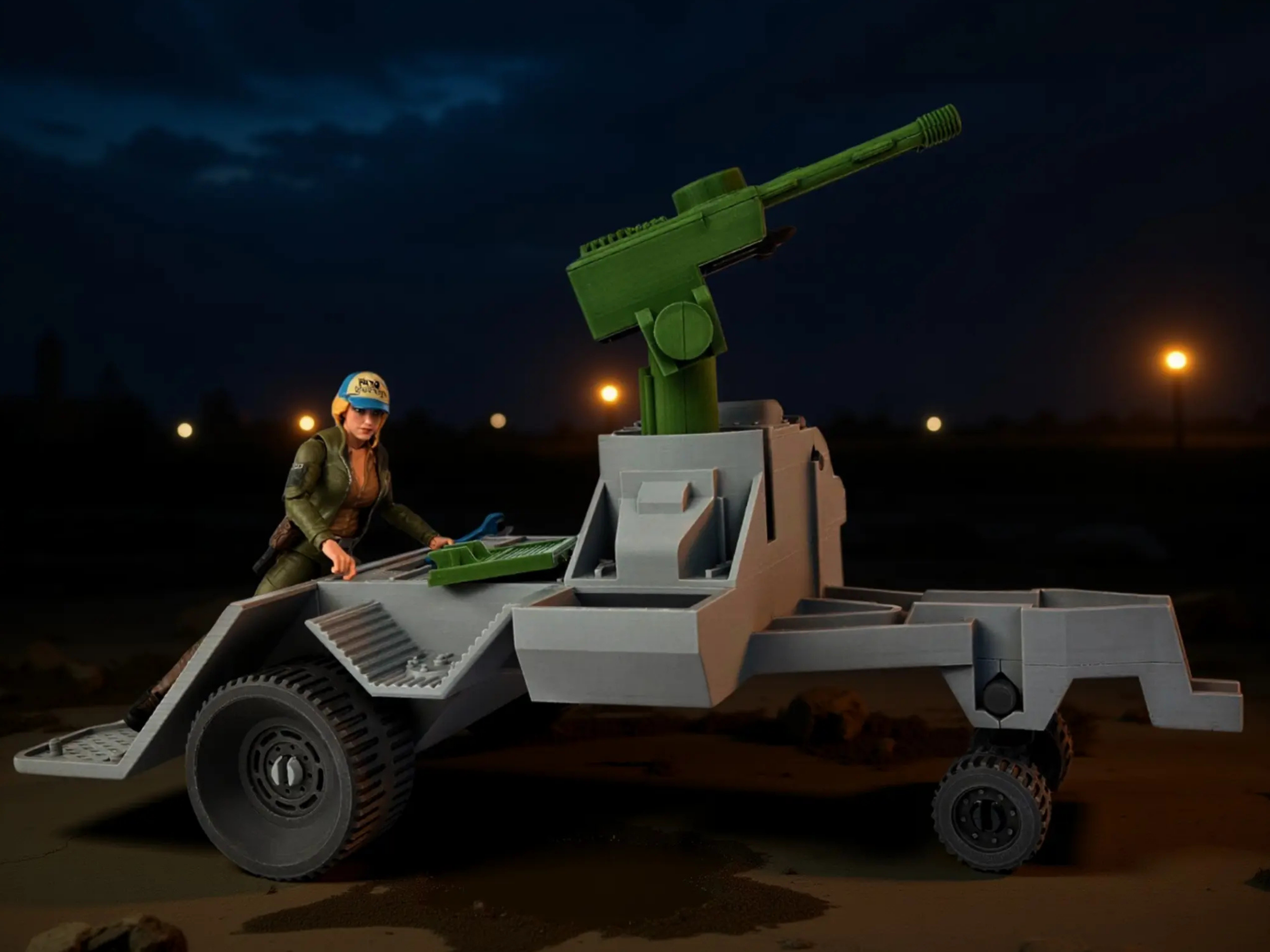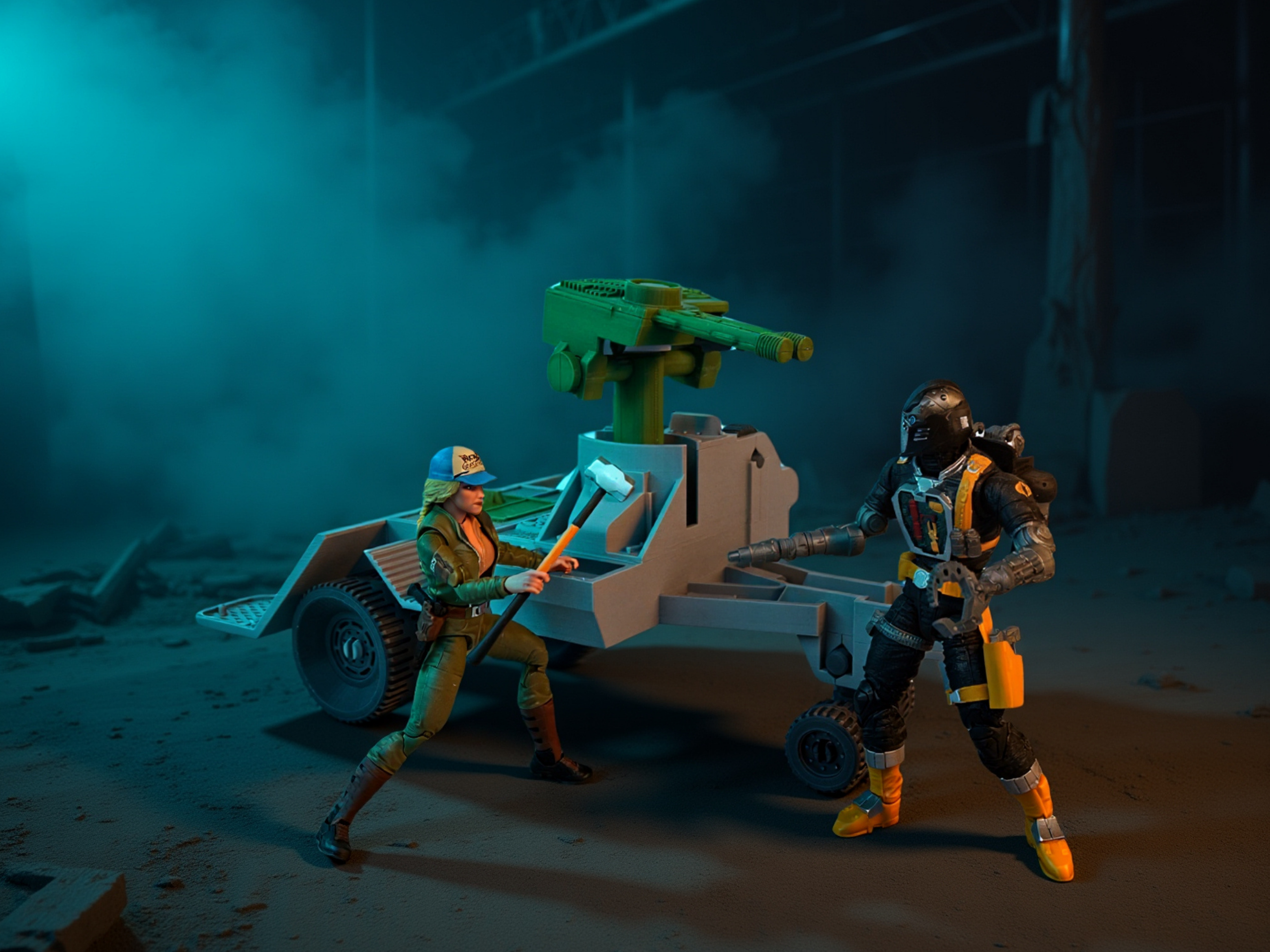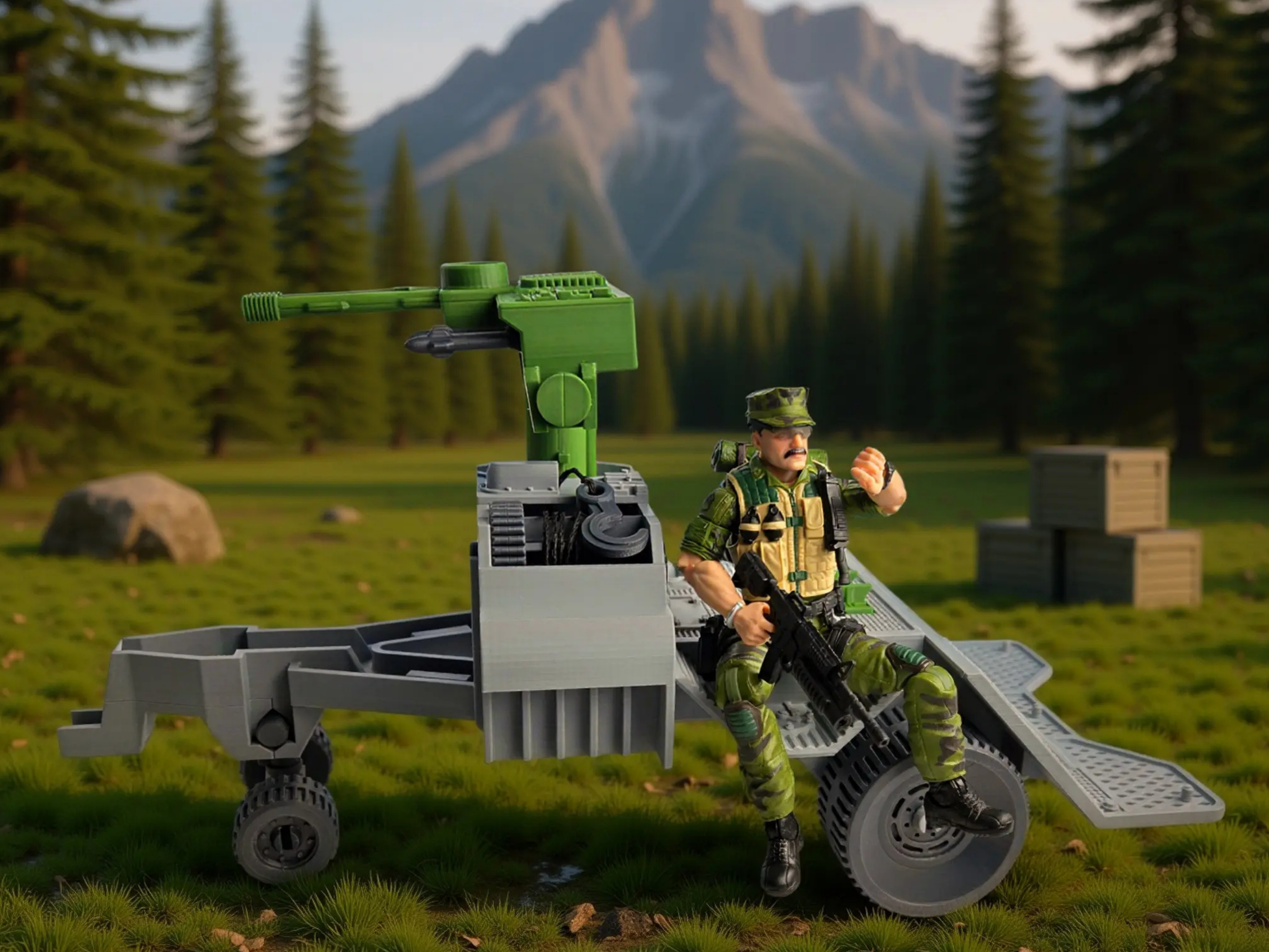 Recover your damaged vehicle before Cobra recovers them and repairs them for Cobra! The Road Toad battlefield recovery vehicle is used as a tow dolly to get your vehicle back to headquarters for repairs. Equipped with a swiveling turret multi position machine gun and two removeable guided missiles for defense in any direction! Features a removeable engine cover to to allow any necessary maintenance and repairs. Working winch to help pull damaged vehicles up on the tow dolly. Front wheels pivot upwards to aid in hitching it up to vehicles and get them to towing! Does not fit the Thunder Machine due to the jet engine nozzle. Made to fit GI Joe Classified scale, Valaverse, or other 1:12 scale figures. No action figures, other vehicles, or props are included, for illustration only.